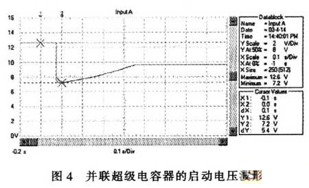 蓄電池是汽車中的關(guān)鍵電器部件,其性能直接影響汽車的啟動。現(xiàn)在的汽車啟動無一例外地采用啟動電動機(jī)啟動方式。在啟動過程中特別是在啟動瞬間,由于啟動電動機(jī)轉(zhuǎn)速為零,不產(chǎn)生感生電勢,故啟動電流:I=E/(RM+RS+RL);其中:E為蓄電池空載端電壓,RM為啟動電動機(jī)的電樞電阻,RS為蓄電池內(nèi)阻、RL為線路電阻。由于RM、RB、RL均非常低,啟動電流非常大。例如用12V、45Ah的蓄電池啟動安裝1.9L柴油機(jī)的汽車,蓄電池的電壓在啟動瞬間由12.6V降到約3.6V,啟動過程的蓄電池電壓波形如圖1所示。啟動瞬時(shí)的電流達(dá)550A,約為蓄電池的12C的放電率>啟動過程的蓄電池電流波形如圖2所示。電流傳感器的電流/電壓變換比率為100A/V。盡管車用蓄電池是啟動專用蓄電池,可以高倍率放電,但從圖l可以看出,10倍以上高倍率放電時(shí)的蓄電池性能變得很差,而且,如此高倍率放電對蓄電池的損傷也是非常明顯的。啟動過程的電壓劇烈變化也是極強(qiáng)的電磁干擾,可以造成電氣設(shè)備掉電,迫使電氣設(shè)備在發(fā)電機(jī)啟動過程結(jié)束后重新上電,計(jì)算機(jī)在這個(gè)過程中非常容易死機(jī)。因此,從改善汽車電氣設(shè)備的電磁環(huán)境、改善汽車的啟動性能和蓄電池性能或延長蓄電池使用壽命來考慮,改善汽車電源在啟動過程中的性能是必要的。解決問題的方案之一是加大蓄電池的容量,但需要增加很多,并使其體積增大,這并不是好的選擇。而將超級電容器與蓄電池并聯(lián)可以很好地解決這個(gè)問題。