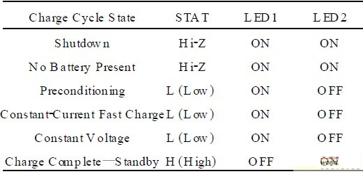 表1MCP73831電路設計中指示燈的邏輯關系