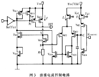 由上面分析可知,由于N2節(jié)點電壓迅速變化,導致大的浪涌電流流過P功率管(VMP管)。因此只需要控制N2節(jié)點電壓的變化就可以實現電流的控制,控制該浪涌電流變化無非就是控制其變化的斜率和峰值。其具體的電路原理圖包括兩個部分,即浪涌電流的斜率控制部分和峰值控制部分。具體的實現電路如圖3所示。