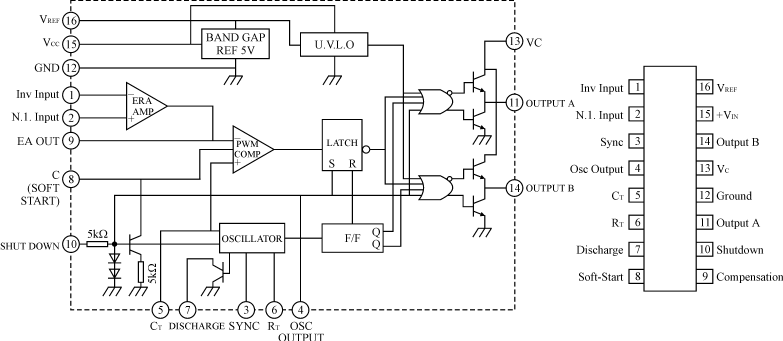 SG3525為16腳芯片,具體的內部結構和封裝如圖3所示。其中,腳16為SG3525的基準電壓源輸出,精度可以達到(5.1±1%)V,采用了溫度補償,而且設有過流保護電路。腳5,腳6,腳7內有一個雙門限比較器,內電容充放電電路,加上外接的電阻電容電路共同構成SG3525的振蕩器。振蕩器還設有外同步輸入端(腳3)。腳1及腳2分別為芯片內誤差放大器的反相輸入端、同相輸入端。該放大器是一個兩級差分放大器,直流開環(huán)增益為70dB左右。根據系統(tǒng)的動態(tài)、靜態(tài)特性要求,在誤差放大器的輸出腳9和腳1之間一般要添加適當的反饋補償網絡。