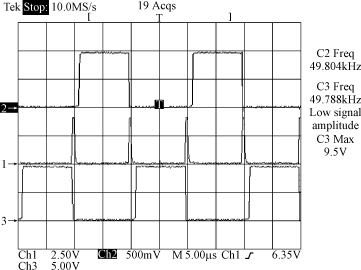 圖6(a)中,SG3525的兩路輸出vgs1及vgs2的最大占空比約為48.5%。死區(qū)時間可以根據電路需要任意調節(jié)。在PWM Buck三電平變換器中,開關頻率為50kHz,從圖中可以看出驅動信號的頻率即為所需。要實現對驅動信號頻率的調節(jié)也變得非常簡單,只需要調節(jié)SG3525的振蕩器頻率即可。