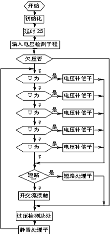 系統(tǒng)接通市電,合上電源開關(guān)后,單片機(jī)進(jìn)行初始化,延時(shí)2秒后,進(jìn)行輸入電壓檢測,若輸入電壓在允許范圍內(nèi),則根據(jù)電壓值進(jìn)行相應(yīng)的電壓補(bǔ)償,否則補(bǔ)償電路不進(jìn)行任何動作,但要相應(yīng)的聲光告警;電壓調(diào)整完畢達(dá)到輸出標(biāo)準(zhǔn)后,自動合上輸出交流接觸器,系統(tǒng)正常輸出。此時(shí),單片機(jī)對輸出電壓進(jìn)行過壓檢測,一旦輸出電壓過高,則切斷輸出,以防輸出電壓過高而影響負(fù)載工作,在電壓恢復(fù)正常后,自動合閘,輸出電壓。單片機(jī)還對輸入電壓進(jìn)行實(shí)時(shí)檢測,只要市電發(fā)生變化,就進(jìn)入相應(yīng)的電壓補(bǔ)償子程序,對補(bǔ)償電壓進(jìn)行調(diào)整。其流程圖見圖5。