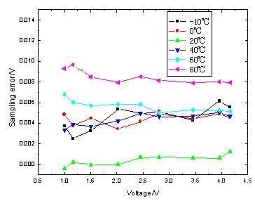 光電繼電器部分的檢測誤差不僅隨著溫度變化,同時也隨著被測量的電壓值變化,從圖3中可以看到,同一測量溫度下,1V與4V的被測量電壓之間的測量誤差達到12mV。從圖5中可以看到,而采樣系統(tǒng)的誤差僅僅同溫度有關(guān),而與被測量電壓值無關(guān)。