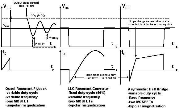 圖1所示為采用三種不同拓?fù)?(準(zhǔn)諧振反激式拓?fù)洹LC諧振拓?fù)浜褪褂密涢_關(guān)技術(shù)的非對(duì)稱半橋拓?fù)? 的開關(guān)的電壓和電流波形。