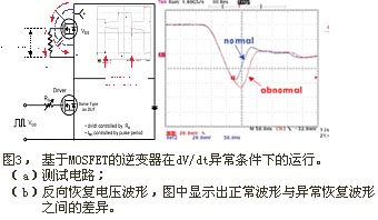 通常,增加?xùn)艠O阻抗會降低MOSFET的開關(guān)速度。在如圖3(a)所示的半橋電路中,如果高壓側(cè)MOSFET的柵極阻抗 (在HVIC中實現(xiàn)) 大,將會存在一定的短路電流;這個電流是上面那個MOSFET導(dǎo)通時的密勒電容Cgd感應(yīng)產(chǎn)生的,不嚴重時一般不會察覺。但是,正如圖3(b)所示,這種異常行為會增加逆變開關(guān)的損耗 (導(dǎo)通損耗),并最終減弱系統(tǒng)的額定功率和穩(wěn)定性。在這樣的瞬態(tài)過程中,要降低開關(guān)速度,同時又不失穩(wěn)定性,上方那個MOSFET的Vgs應(yīng)小于閾值電壓Vth。換句話說,最好通過調(diào)節(jié)HVIC的關(guān)斷阻抗來保證系統(tǒng)的穩(wěn)定性,防止因電壓變化而感應(yīng)短路電流。但這會增加MOSFET的關(guān)斷dV/dt值。