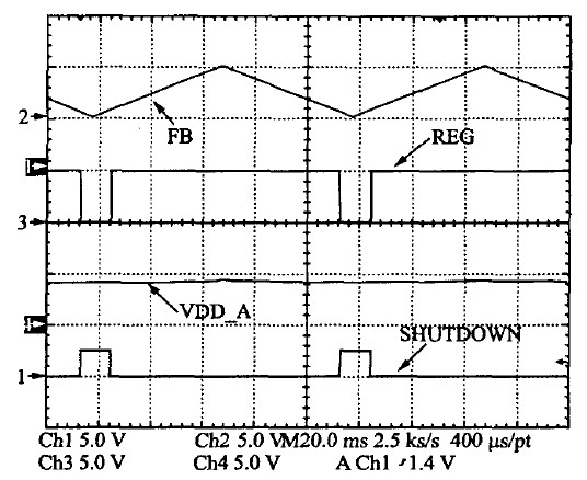 系統(tǒng)的多模式控制測(cè)試結(jié)果見(jiàn)圖13。中載或重載下系統(tǒng)采用PWM 模式工作,許多單元的供電電源為REG=5 V.極輕載條件下則關(guān)斷5 V的供電電源,減小系統(tǒng)的待機(jī)功耗,同時(shí)也有利于減小EMI和噪聲。其過(guò)程如下:當(dāng)FB電壓低于一個(gè)閾值時(shí),待機(jī)模式選擇,則SHUTDOWN信號(hào)變高,關(guān)斷5 V 電壓源REG模塊,同時(shí)VDD-AD繼續(xù)給芯片供電,保證在輕載時(shí)芯片的檢測(cè)能夠連續(xù)實(shí)現(xiàn)。