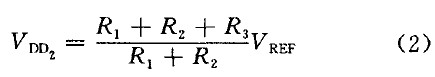 時(shí),比較器跳轉(zhuǎn),N1開(kāi)通,UVLO-out開(kāi)始變l.通過(guò)合理設(shè)置R1、R2、R3值就可以使VDD1=9.5 V,VDD2=7V,即VDD上升到9.5 V時(shí)UVLO輸出為零,芯片正常工作; VDD下降到7 V 時(shí)芯片停止工作。