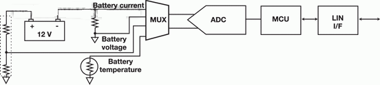 (1) 電池檢測:電池電壓通過一個(gè)直接從電池正極分接出來的阻性衰減器來檢測。為檢測電流,將一個(gè)檢測電阻(12V應(yīng)用一般使用100mΩ)放在電池負(fù)極與地之間。在這種配置中,汽車的金屬底盤一般為地,檢測電阻安裝在電池的電流回路中。在其它配置中,電池的負(fù)極是地。對(duì)于SoH計(jì)算,還必須檢測電池的溫度。