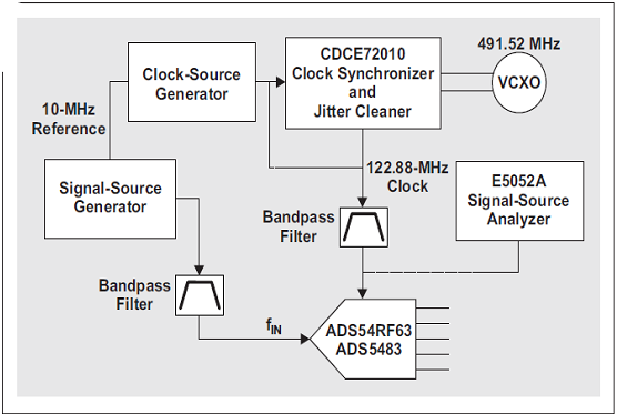 我們做了一個(gè)試驗(yàn),目的是檢查測(cè)得時(shí)鐘相位噪聲與提取自 ADC 測(cè)得 SNR 的時(shí)鐘抖動(dòng)的匹配程度。如圖 11 所示,一個(gè)使用 Toyocom 491.52-MHz VCXO 的 TI CDCE72010 用于產(chǎn)生 122.88-MHz 采樣時(shí)鐘,同時(shí)我們利用 Agilent 的 E5052A 來(lái)對(duì)濾波相位噪聲輸出進(jìn)行測(cè)量。利用一個(gè) SNR 主要受限于采樣時(shí)鐘抖動(dòng)的輸入頻率對(duì)兩種不同的 TI 數(shù)據(jù)轉(zhuǎn)換器(ADS54RF63 和 ADS5483)進(jìn)行評(píng)估??焖俑道锶~變換 (FFT) 的大小為 131000 點(diǎn)。