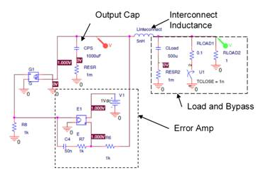 為了討論方便,圖1顯示了電源系統(tǒng)的P-SPICE模型。本圖由補償電路電源、調(diào)制器(G1)和輸出電容器組成。內(nèi)部還包括互連電感、旁路電容負載模型、DC負載和步進負載。