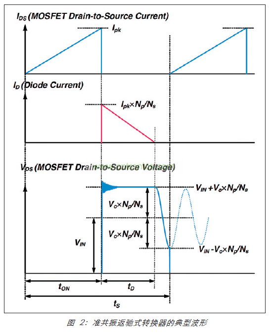 圖 2 顯示準(zhǔn)共振返馳式轉(zhuǎn)換器的典型波形。如果二極管電流在 MOSFET 關(guān)閉后達(dá)到零,則 MOSFET VDS 會由于原邊電感器 (Lm) 與 MOSFET 輸出電容器 Coss 之間的共振而開始振蕩。在 VDS 達(dá)到其最小值時(因漏極與源極之間的電容負(fù)載,降低 MOSFET 導(dǎo)通開關(guān)損耗),通過開啟 MOSFET 來實現(xiàn)準(zhǔn)共振交換。設(shè)計變壓器匝數(shù)比 Np/Ns,以便共振振幅大于 VIN,從而使零電壓開關(guān) MOSFET 能夠?qū)崿F(xiàn)。