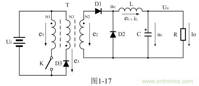 在圖1-17中,需要特別注意的是開關(guān)變壓器初、次級(jí)線圈的同名端。如果把開關(guān)變壓器初線圈或次級(jí)線圈的同名端弄反,圖1-17就不再是正激式變壓器開關(guān)電源了。