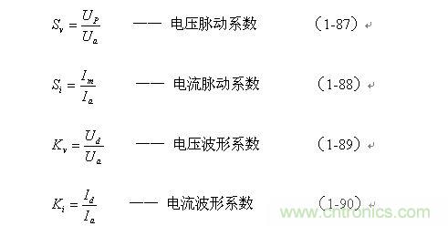 上面4式中,Sv、Si、Kv、Ki分別表示:電壓和電流的脈動(dòng)系數(shù)S,和電壓和電流的波形系數(shù)K,在一般可以分清楚的情況下一般都只寫字母大寫S或K。脈動(dòng)系數(shù)S和波形系數(shù)K都是表征電壓或者電流好壞的指標(biāo),S和K的值,顯然是越小越好。S和K的值越小,表示輸出電壓和電流越穩(wěn)定,電壓和電流的紋波也越小。當(dāng)S和K均等于1時(shí),表示電壓和電流均為直流。
