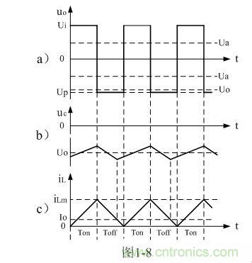 圖1-8、圖1-9、圖1-10分別是控制開關(guān)K的占空比D等于0.5、< 0.5、> 0.5時,圖1-7電路中幾個關(guān)鍵點(diǎn)的電壓和電流波形。圖1-8-a)、圖1-9-a)、圖1-10-a)分別為控制開關(guān)K輸出電壓uo的波形;圖1-8-b)、圖1-9-b)、圖1-10-b)分別為儲能濾波電容兩端電壓uc的波形;圖1-8-c)、圖1-9-c)、圖1-10-c)分別為流過儲能電感L電流iL的波形。應(yīng)該特別注意的是,圖1-8-c)、圖1-9-c)、圖1-10-c)中的電流波形按原理應(yīng)該取負(fù)值,但取負(fù)值后反而覺得與前面圖1-5與圖1-6不好對比和分析,因此,當(dāng)進(jìn)行具體計算時,一定要注意電流和電壓的方向。
