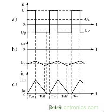 圖1-7中,Ui為輸入電源,K為控制開關(guān),L為儲能電感,D為整流二極管,C為儲能濾波電容,R為負(fù)載電阻。當(dāng)控制開關(guān)K接通的時候,輸入電源Ui開始對儲能電感L加電,流過儲能電感L的電流開始增加,同時電流在儲能電感中也要產(chǎn)生磁場;當(dāng)控制開關(guān)K由接通轉(zhuǎn)為關(guān)斷的時候,儲能電感會產(chǎn)生反電動勢,使電流繼續(xù)流動,并通過整流二極管D進(jìn)行整流,再經(jīng)電容儲能濾波,然后向負(fù)載R提供電流輸出??刂崎_關(guān)K不斷地反復(fù)接通和關(guān)斷過程,在負(fù)載R上就可以得到一個負(fù)極性的電壓輸出。
