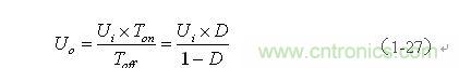 由(1-27)式可以看出,反轉(zhuǎn)式串聯(lián)開關(guān)電源輸出電壓與輸入電壓與開關(guān)接通的時間成正比,與開關(guān)關(guān)斷的時間成反比,而與儲能電感L的大小無關(guān);與儲能電感L有關(guān)的是輸出電流的大小,電流的大小隱含在(1-21)、(1-25)、(1-26)式中。