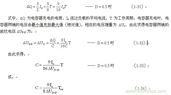 (1-33)和(1-34)式,就是計算反轉(zhuǎn)式串聯(lián)開關(guān)電源儲能濾波電容的公式(D = 0.5時)。式中:Io是流過負(fù)載電流的平均值,T為開關(guān)工作周期,ΔUP-P為濾波輸出電壓的波紋。一般波紋電壓都是取峰-峰值,因此,當(dāng)D = 0.5時,波紋電壓正好等于電容器充電的電壓增量,即:ΔUP-P = ΔUc 。