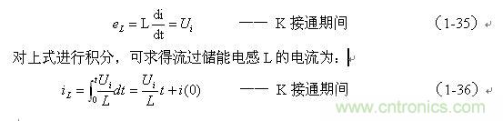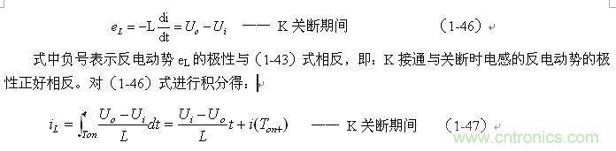 式中的負(fù)號(hào)表示反電動(dòng)勢(shì)eL的極性與(1-35)式中的符號(hào)相反,即: K關(guān)斷期間電感L產(chǎn)生電動(dòng)勢(shì)的方向與K接通期間電感L產(chǎn)生電動(dòng)勢(shì)的方向正好相反。