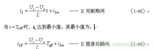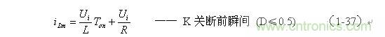 式中i(Ton+) 為控制開關(guān)K從Ton轉(zhuǎn)換到Toff的瞬間之前流過(guò)電感的電流,i(Ton+)也可以寫為i(Toff-),即:控制開關(guān)K關(guān)斷或接通瞬間,之前和之后流過(guò)電感L的電流相等。實(shí)際上(1-47)式中的i(Ton+) 就是(1-45)式中的iLm,因此,(1-47)式可以改寫為: