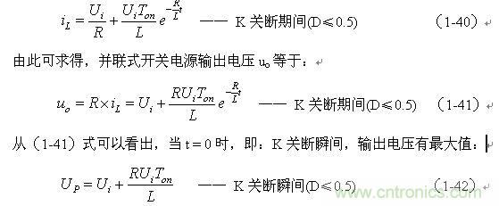 式中C為待定常數(shù),把初始條件(令t = 0)代入上式,很容易就可求出C。由于控制開關(guān)K由接通狀態(tài)突然轉(zhuǎn)為關(guān)斷時(shí),流過(guò)儲(chǔ)能電感L中的電流iL不能突變,即i(Ton+) = i(Toff—),并且正好等于流過(guò)儲(chǔ)能電感L的最大電流ILm ,因此(1-39)式可以寫為:
