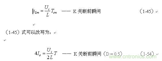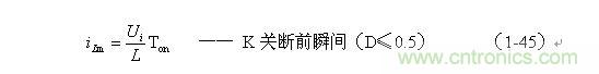 (1-44)式中iL為流過(guò)儲(chǔ)能電感L的電流(瞬時(shí)值),t為時(shí)間變量;i(0)為的初始電流,即:控制開關(guān)K接通前的瞬間流過(guò)儲(chǔ)能電感L中的電流。當(dāng)開關(guān)電源工作于電流臨界連續(xù)狀態(tài),或不連續(xù)電流狀態(tài)時(shí)(即D≤0.5),i(0) = 0 ,由此可以求得流過(guò)儲(chǔ)能電感L的最大電流為:
