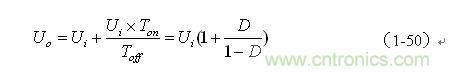 當(dāng)并聯(lián)式開關(guān)電源工作于電流臨界連續(xù)狀態(tài)時(shí),流過(guò)儲(chǔ)能電感的初始電流i(0)等于0(參看圖1-13),即:(1-49)式中流過(guò)儲(chǔ)能電感電流的最小值iLX等于0。因此,由(1-45)和(1-49)式,可求得并聯(lián)式開關(guān)電源輸出電壓Uo為: