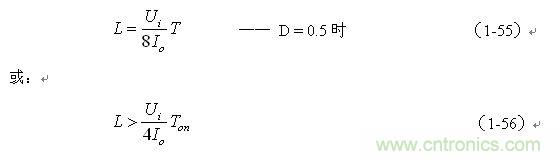 (1-55)和(1-56)式,就是計(jì)算并聯(lián)式開關(guān)電源儲(chǔ)能電感的公式。同理,(1-55)和(1-56)式的計(jì)算結(jié)果,只給出了計(jì)算并聯(lián)式開關(guān)電源儲(chǔ)能電感L的中間值,或平均值,對(duì)于極端情況可以在平均值的計(jì)算結(jié)果上再乘以一個(gè)大于1的系數(shù)。