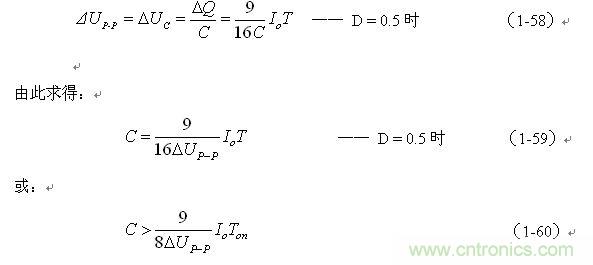 (1-59)和(1-60)式,就是計(jì)算并聯(lián)式開關(guān)電源儲(chǔ)能濾波電容的公式。式中:Io是流過(guò)負(fù)載電流的平均值,T為開關(guān)工作周期,ΔUP-P為濾波輸出電壓紋波,此紋波電壓ΔUP-P實(shí)際上就是電容器兩端的充放電電壓增量,即:ΔUP-P = ΔUc 。