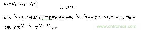 設(shè)圓柱形兩層線圈之間的距離為d,高度為h,平均周長為g 。假定兩層線圈之間沿高度的電位差為線性變化,即: