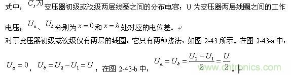 對于圖2-43-a,可求得變壓器初級或次級兩層線圈之間的分布電容為: