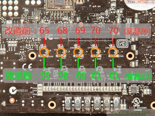 看下改造前后的供電模塊溫度吧,使用紅外測溫槍對準(zhǔn)供PCB背面供電模塊的位置分別取5個測量點(diǎn),測試使用FC2的benchmark tool連續(xù)運(yùn)行25分鐘后進(jìn)行溫度采集。沒有空調(diào),室溫不固定,沒有辦法,不過還是能看出改造后供電模塊的溫度的確有明顯的下降,刨去室溫的差距后應(yīng)該還能有5度以上的溫差。另外溫度的下降在另一個方面說明供電模塊的效率提升,只是忙著改造忘記在之前測一下功率了,個人感覺應(yīng)該能省5瓦左右的功率吧。