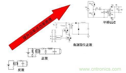 圖2. 隨著功率及功率密度的提升,半橋LLC拓?fù)涑蔀長(zhǎng)ED路燈驅(qū)動(dòng)理想選擇