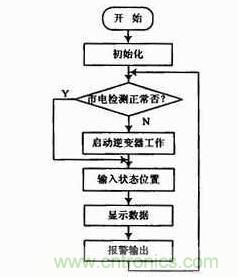 單片機(jī)在初始化程序中完成對單片機(jī)、SA4828以及其他可編程器件的初始化,接著對市電進(jìn)行檢測,如果市電不正常,則啟動逆變器工作,通過控制將開關(guān)元件切換至逆變器輸出。并將輸入狀態(tài)存入控制寄存器,顯示數(shù)據(jù),如果輸出電壓或保護(hù)等發(fā)生改變,則報警輸出以采取措施使系統(tǒng)正常運行。