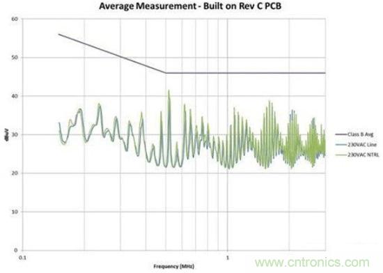 注意,漏極連接與輸入引線之間有一些由輸入電容器提供的屏蔽。該電容器的外殼連接至主接地,可為共模電流提供返回主接地的路徑。如圖2所示,這個(gè)微小的電容會(huì)導(dǎo)致電源EMI簽名超出規(guī)范要求。