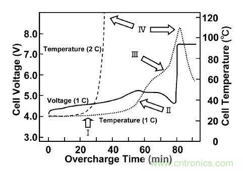 下圖是鋰離子電池過充電測試的一個(gè)事例??梢钥闯龀潆娺^程中鋰離子電池芯內(nèi)部溫度和電壓的變化情況,正常1C充電時(shí),電池芯的溫度隨恒流充電慢慢升高,而隨恒壓階段電流減小慢慢降低,整個(gè)過程溫度可控,安全。當(dāng)大電流(2C或以上)時(shí),電池芯內(nèi)部反應(yīng)劇烈發(fā)生熱失控,溫度急劇升高而發(fā)生起火或爆炸。