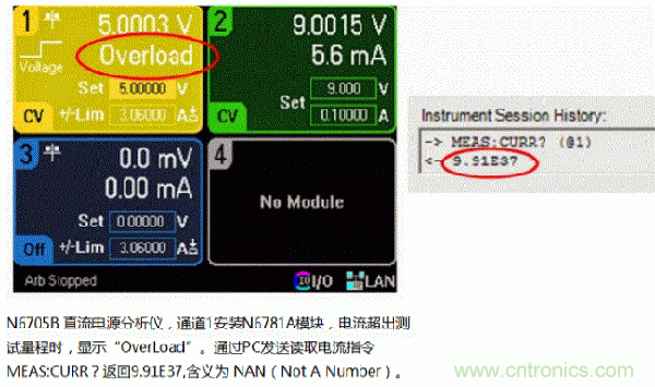 設(shè)定N6781A源表模塊的電流量程1mA,然后控制輸出電流超過(guò)1mA。此時(shí),顯示屏上直接顯示“OverLoad”,而不是電流的數(shù)值。如果通過(guò)PC發(fā)送讀取電流指令,你會(huì)讀到9.91E37,這個(gè)數(shù)值9.91E37在SCPI(儀表編程命令標(biāo)準(zhǔn))中被定義為“NAN”(Not A Number)。所有是德科技的測(cè)試儀表都是遵循SCPI標(biāo)準(zhǔn)的,當(dāng)實(shí)際值超出量程時(shí),電源返回9.91E37。NAN(9.91E37)實(shí)際代表一個(gè)32bit浮點(diǎn)數(shù),在所有測(cè)量?jī)x表中預(yù)計(jì)都不會(huì)出現(xiàn)這么大的數(shù)值。
