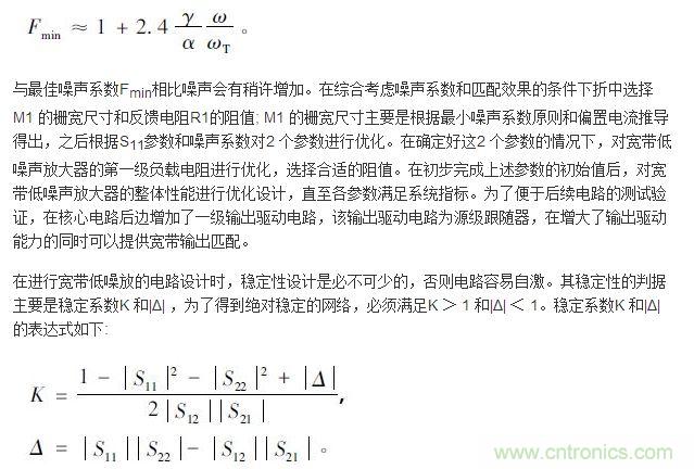 【導讀】本文給出了一種1 ~ 3 GHz 頻段的寬帶低噪聲放大器的設計,電路采用電阻負反饋結(jié)構,采用SMIC 0.18 μm RF CMOS 工藝對寬帶低噪聲放大器進行了優(yōu)化分析和仿真,結(jié)果表明在寬帶匹配、通道增益及噪聲系數(shù)方面都取得了較好的性能,對于寬帶低噪聲放大器的設計具有一定的參考價值。