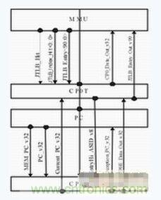 協(xié)助TLB進(jìn)行虛實(shí)地址轉(zhuǎn)換是CP0的主要功能之一。TLB屬于系統(tǒng)的特權(quán)資源,只有CP0有權(quán)對(duì)其進(jìn)行訪問(wèn),因此CP0與TLB之間的連線較多,數(shù)據(jù)交換的時(shí)延也比較關(guān)鍵。同時(shí),PC模塊與CP0的數(shù)據(jù)交換也非常重要。因此,CP0單元在版圖上最好同時(shí)靠近TLB和PC模塊。本設(shè)計(jì)將CP0中與TLB相關(guān)的邏輯與寄存器獨(dú)立為CP0T,放在MMU與PC模塊之間;CP0的其余部分歸為CP0E,放在PC下部,也就是整塊芯片的最下端。如下圖所示。
