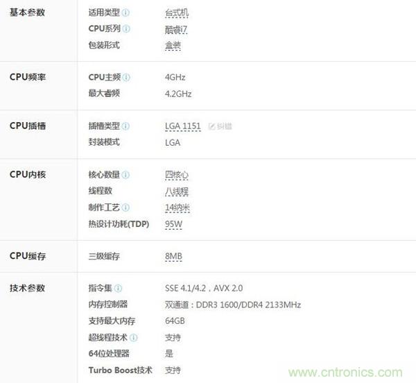 CPU一般由三部分組成:邏輯運(yùn)算單元、控制單元和存儲(chǔ)單元組成。我們看一下Intel i7 6700k具體參數(shù):