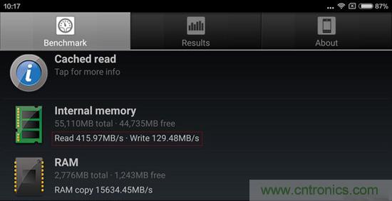 工具——“A1 SD Bench”的速度測試中,小米5(高配版)機身存儲(注:UFS 2.0閃存)讀取速度為415.97MB/s,寫入速度則為129.48MB/s。