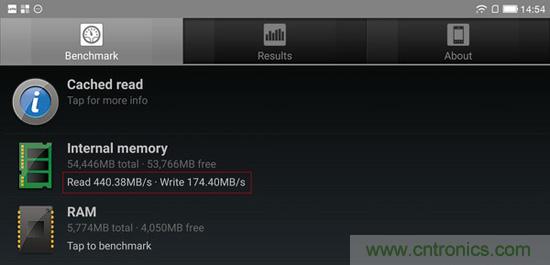 同時,我們又測試了另一款UFS 2.0閃存智能手機——樂Max 2。它的讀取速度為440.38MB/s,寫入速度則為174.40MB/s,相比小米5的讀寫速度更快一些。由此不難看出,盡管都采用UFS 2.0閃存,但是終端產(chǎn)品不同,其讀寫速度依然會存在一定差異。