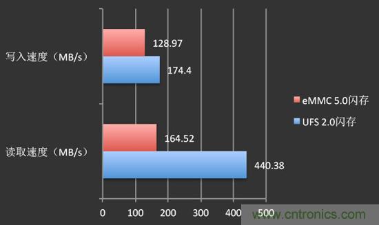 通過上面的測試,大家能夠看到,UFS 2.0閃存智能終端產(chǎn)品的讀取速度一般都能夠達到400MB/s以上,而寫入速度則在100MB/s以上。換句話說,大小為5MB左右的MP3歌曲,UFS 2.0閃存一秒即可寫入20首以上,夠不夠快呢?另外,這樣的速度究竟處于怎樣的水平?相比時下常見的eMMC 5.0閃存解決方案,優(yōu)勢究竟有多少呢?我們還是用數(shù)據(jù)來說話。