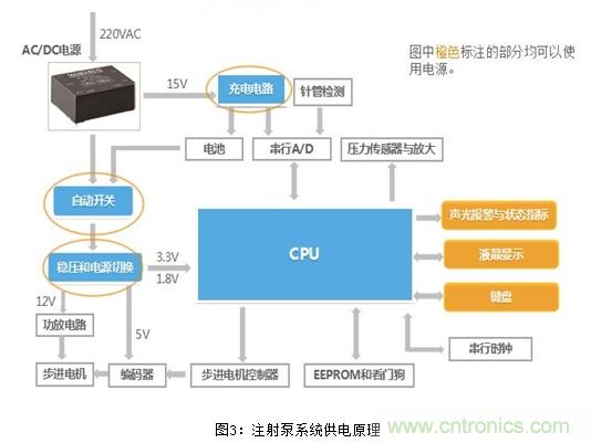 圖3為智能注射泵控制系統(tǒng)供電原理框圖,系統(tǒng)工作情況如下: