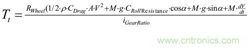 根據(jù)受力分析,我們可以推導(dǎo)出電動(dòng)汽車行駛驅(qū)動(dòng)力公式、驅(qū)動(dòng)阻力公式、摩擦阻力公式、坡道阻力公式和加速阻力公式,進(jìn)而可得到電動(dòng)汽車的動(dòng)態(tài)運(yùn)動(dòng)微分方程: