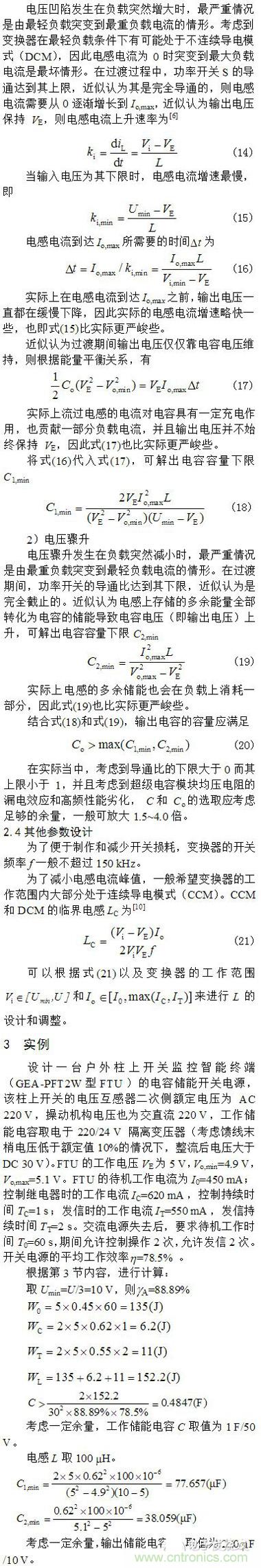 根據(jù)能量平衡關(guān)系,分析了負載突然增大和負載突然減輕情況下的最嚴(yán)重電壓凹陷和電壓驟升,并得出輸出濾波電容容量的設(shè)計考慮。以一個具體的電容儲能FTU電源為例,詳細說明了電路參數(shù)的設(shè)計方法,并進行了實驗研究。實驗結(jié)果表明所設(shè)計的電容儲能備用電源能夠滿足在失去正常供電電源后自動化終端待機、操作和通信的需要,并且所進行的理論分析與實際情況相符。