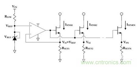 最終MOSFET(金氧半場效晶體管)源電壓VS以及RSET電阻決定著各柱上的灌電流(sink current);通過去除來自外部電流沉柱的反饋(即所有N》1),已失去對(duì)VSN的直接控制。因此,RSETN必須精心選擇以生成預(yù)期的任意第N個(gè)柱的灌電流,即ISINKN。仔細(xì)觀察上面的圖1,很容易得出定義偏置網(wǎng)絡(luò)第N個(gè)柱電流與第1個(gè)柱電流的比值的等式︰