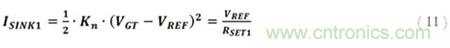 必須注意的是,這里可以很大程度上忽略通道寬度調(diào)制的影響。這是因?yàn)槿魏我蚵O電壓上升導(dǎo)致的漏極電流的上升會(huì)在通過RSET電阻后下降,并導(dǎo)致源電壓的上升。為了使MOSFET能維持任何電流,柵極電壓必須大于源電壓與閾值電壓的和。也就是說,給定一個(gè)柵極電壓,源電壓將被限制在至少比柵極電壓小一個(gè)閾值電壓的值,且再大的漏極電壓上升也不會(huì)提升漏極電流。因此,構(gòu)建相應(yīng)運(yùn)行條件,RSET必須足夠大,從而確保在上述限制下可允許作出以下假設(shè):