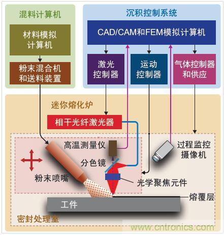 混料系統(tǒng)包含幾種不同的熔覆粉末以及配備了材料模擬軟件的計算機。迷你熔化爐包括光纖激光器和密封處理室,而后者包含光學聚焦元件、送粉噴嘴、運動系統(tǒng)、高溫測量儀及過程監(jiān)控攝像機。沉積控制系統(tǒng)配置了運行著CAD/CAM軟件和有限元方法(FEM)模擬軟件的計算機。