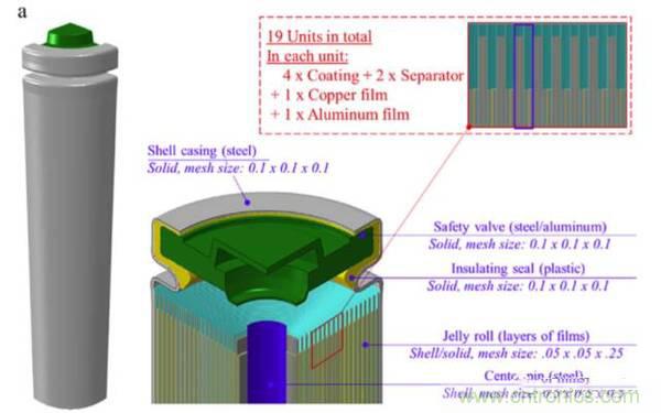 由于在動力電池組中18650電池一般是采用垂直裝配的,在電池組發(fā)生跌落等情況下,軸向擠壓是造成鋰離子電池變形的主要原因,因此Juner Zhu主要研究了在軸向壓力下電池變形導(dǎo)致鋰離子電池短路的機理。一些傳統(tǒng)的模型由于假設(shè)鋰離子電池內(nèi)部是一個均一的整體,因此在預(yù)測18650電池軸向壓縮試驗的時候就無法準確預(yù)測試驗結(jié)果,這主要是由于鋰離子電池電芯的特殊結(jié)構(gòu),導(dǎo)致在電芯的上部和下部并不完全一致,同時由于鋰離子電池上蓋(也就是正極)獨特的結(jié)構(gòu)使得鋰離子電池在承受軸向壓力的時候,可能會在內(nèi)短路發(fā)生之前,就引起鋰離子電池發(fā)生短路。