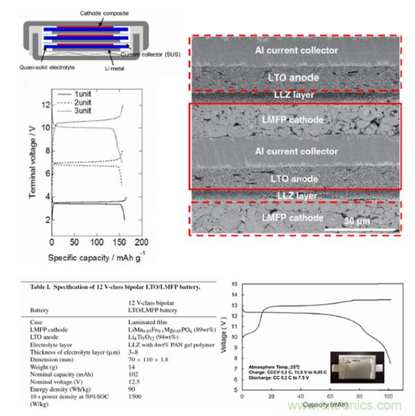 下圖是含有三個雙極性電極的CR2032鈕扣電池。正極是LFP,負極是金屬鋰,采用準固態(tài)聚合物電解質和不銹鋼集流體。從電壓曲線可以看到,只要改變雙極性電極的unit數(shù)量,就能改變電池的電壓,這里給的分別是1unit、2units、3units的電壓曲線。例如,很容易通過5個雙極性的unit實現(xiàn)一個12V的鋰離子電池,下圖右側是日本東芝公司的一個12V雙極性電池的部分截面圖,從表1的參數(shù)中可以看到,這里正極材料是LiMn0.85Fe0.1Mg0.05PO4,負極材料是LTO,集流體是Al,固態(tài)電解質電解質是Li7La3Zr2O12(LLZ)和PAN。從封裝方式來看,疊片式軟包裝是比較適合雙極性電池的一種方式。
